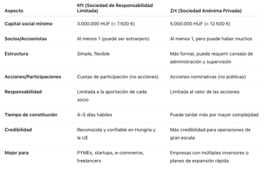 Capital social mínimo: 5.000.000 HUF (≈ 12.500 €).